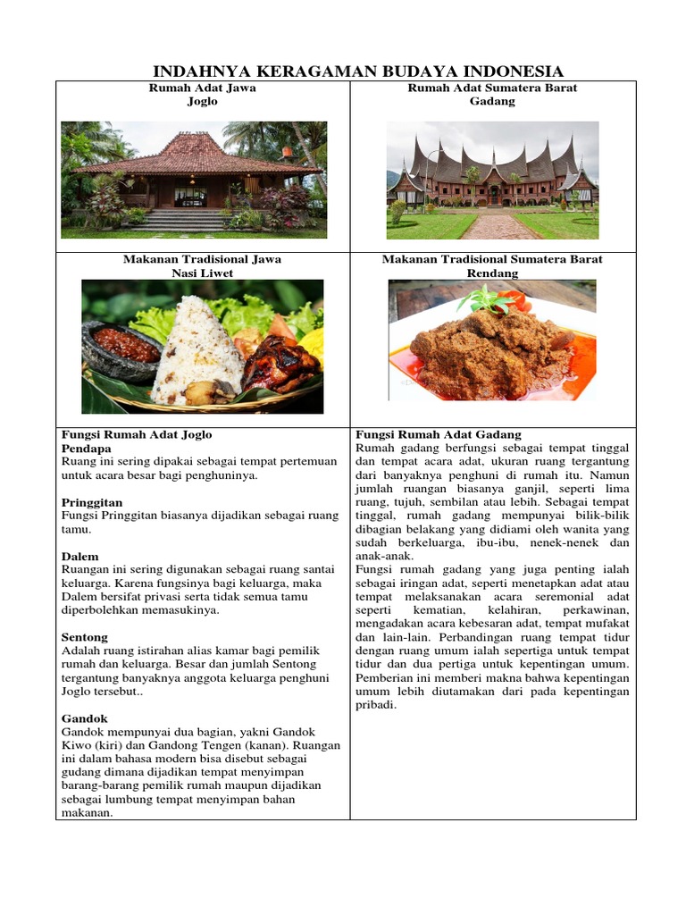 Bukan sekedar hunian, lebih dari itu joglo merupakan suatu simbol yang penuh makna dalam kehidupan masyarakat jawa. Menariknya lagi, rumah adat ini juga mempunyai makna filosofi yang terbilang unik. Gandhok adalah bangunan tambahan yang posisinya mengitari sisi belakang dan juga bagian samping bangunan inti. Biasanya terdapat pada bagian luar rumah tetapi memiliki atap. Pringitan terletak di antara pendapa dengan rumah bagian dalam atau yang biasa disebut omah njero. Bahan asli dari alam ini membuat rumah joglo terasa dingin dan sejuk. Joglo jompongan, joglo kepuhan lawakan, joglo kepuhan limolasan, joglo ceblokan, joglo sinom apitan, dsb. Rumah adat rembang atau joglo bocokan dahulunya rumah jenis ini dindingnya terbuat dari gedeg dalam bahasa jawa artinya anyaman bambu bagi golongan orang kelas bawah, sedangkan bagi golongan kelas menengah keatas dindingnya rumah joglo bocokan terbuat dari papan kayu jati. Ciri khusus rumah ini adalah memiliki jumlah tiang berkelipatan 4. Adat joglo karena pada dasarnya struktur dan fungsi rumah adat joglo mudah dipahami karena intinya sama walaupun terdapat banyak macam jenis rumah adat joglo di pulau jawa. Rumah adat joglo memiliki keunikan dan cirikhas tersendiri pada konsep bangunannya. Indonesia memiliki beragam rumah adat daerah yang unik dan menarik. Berikut merupakan fungsi dari ruangan yang ada di rumah joglo, yaitu: